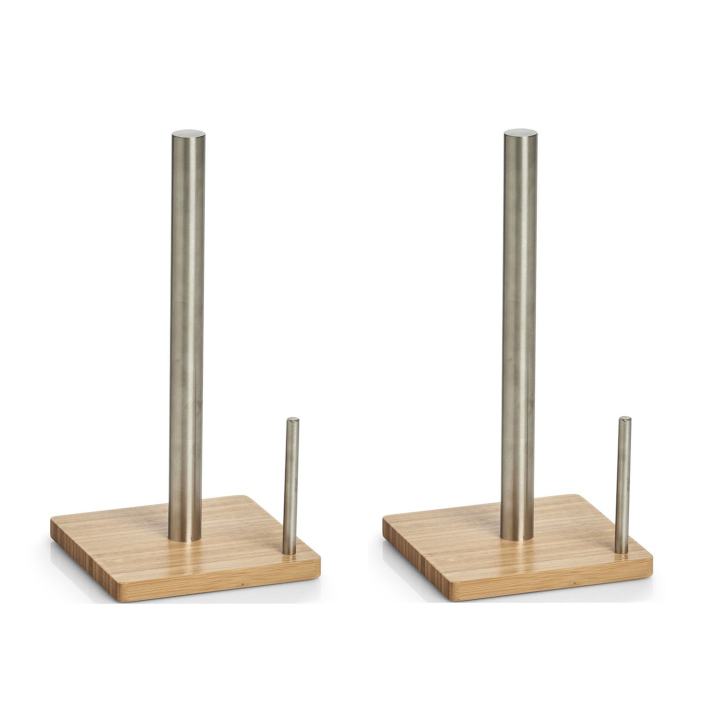2x Bamboe houten keukenrolhouders, met stop waardoor de rol niet zal afrollen.Afmeting: ca. 16 x 16 x 32,5 cm. Materiaal: bamboehout/RVS. Excl. getoonde keukenrol.